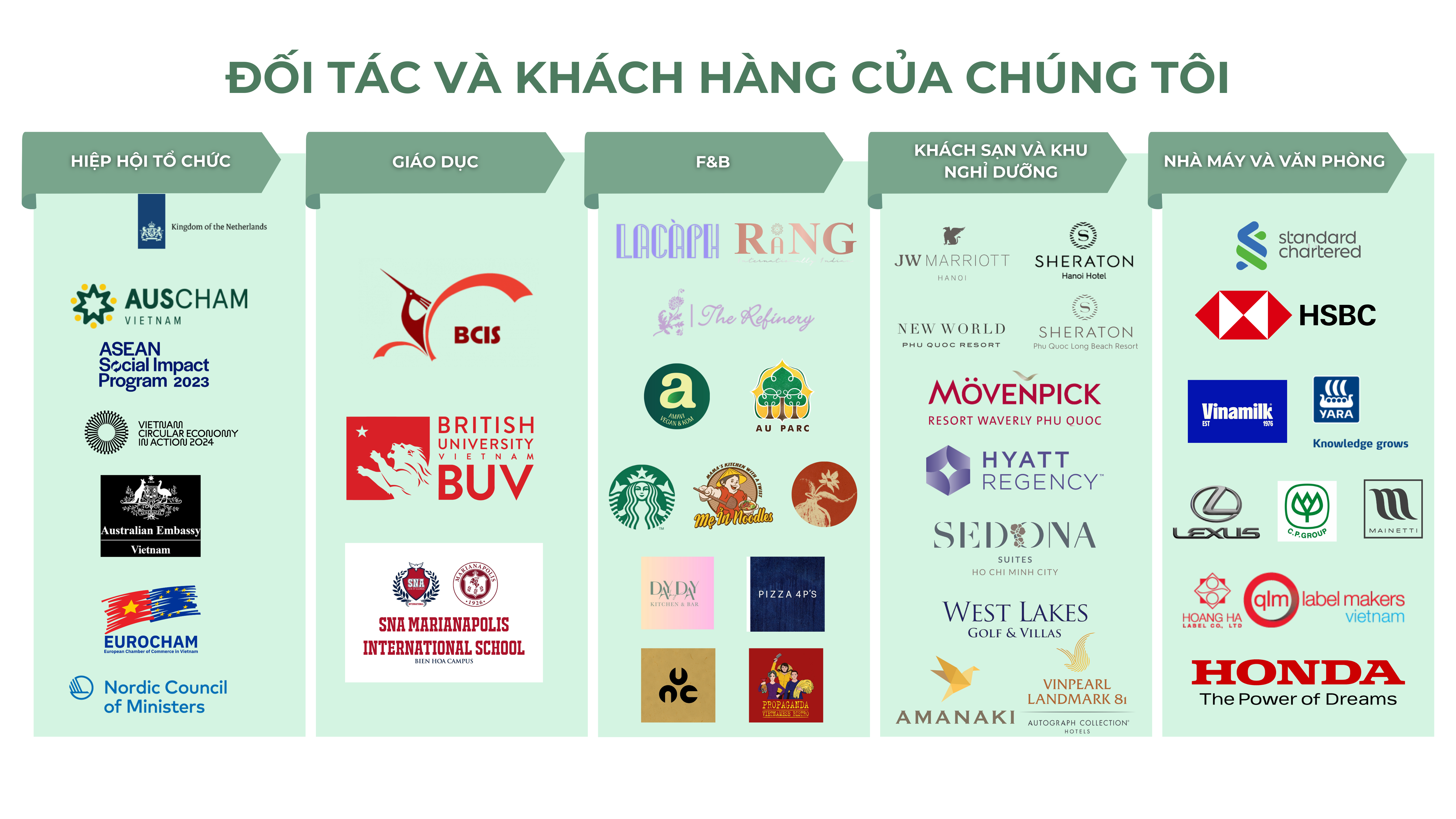 ECO Solutions cung cấp và đồng hành cùng một số Thương hiệu Hàng đầu trong nước và Quốc tế tại Việt Nam để triển khai giải pháp nhằm giảm thiểu rác thải trong các hoạt động kinh doanh. Khách hàng của chúng tôi đã đóng góp một phần không nhỏ vào việc giảm thiểu lượng lớn rác thải đưa đến bãi chôn lấp, giảm lượng khí thải nhà kính và giảm dấu chân Carbon.