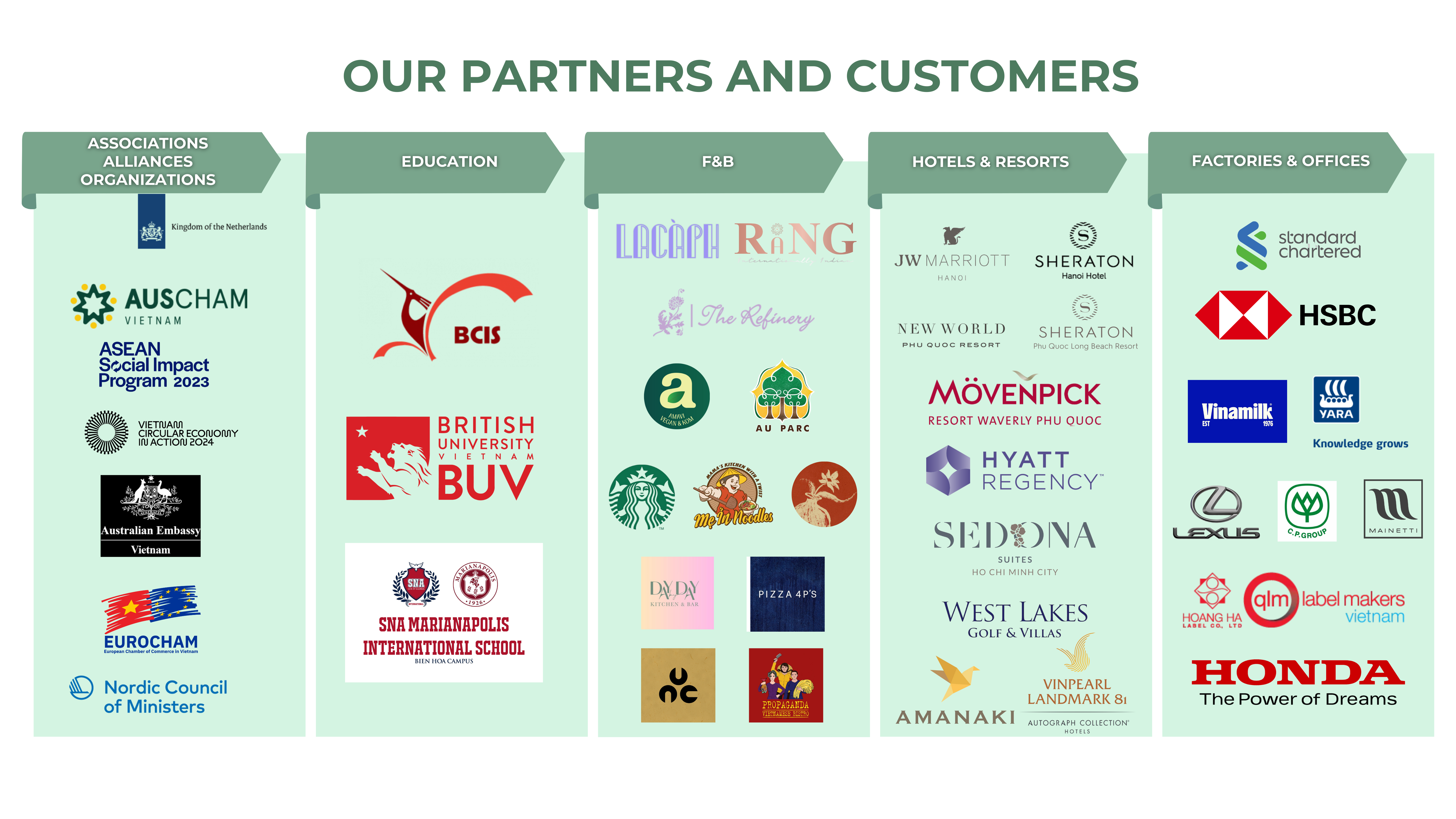 ECO Solutions works with some of the International & Local leading brands in Vietnam to implement a zero waste solution in their operations. Our clients can minimize their waste to landfills, reduce their greenhouse gas emissions, and thus reduce their overall environmental footprint.